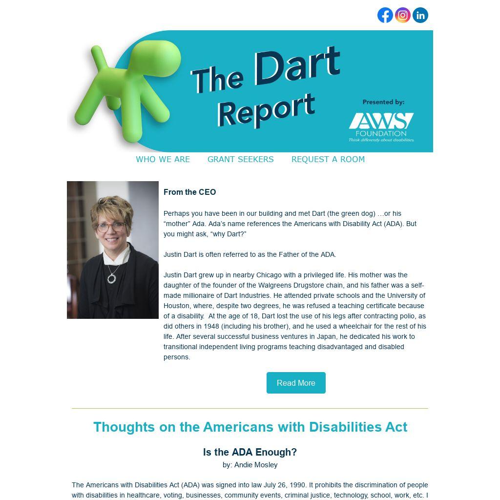 Perhaps you have been in our building and met Dart (the green dog) …or his “mother” Ada. Ada’s name references the Americans with Disability Act (ADA). But you might ask, “why Dart?”