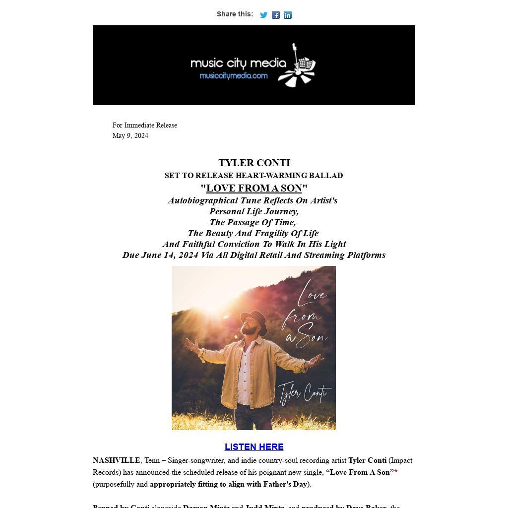 NASHVILLE, Tenn – Singer-songwriter, and indie country-soul recording artist Tyler Conti (Impact Records) has announced the scheduled release of his poignant new single, “Love From A Son”* (purposefully and appropriately fitting to align with Father's Day).