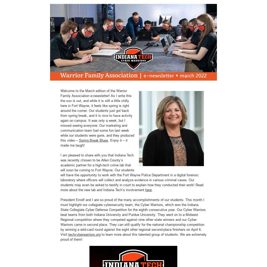 Welcome to the March edition of the Warrior Family Association e-newsletter! As I write this the sun is out, and while it is still a little chilly here in Fort Wayne, it feels like spring is right around the corner. Our students just got back from spring break, and it is nice to have activity again on campus. It was only a week, but I missed seeing everyone. Our marketing and communication team had some fun last week while our students were gone, and they produced this video – Spring Break Blues. Enjoy it – it made me laugh!