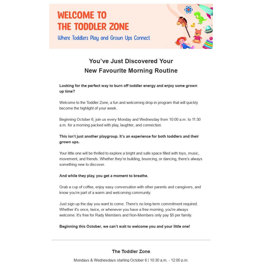 Welcome to the Toddler Zone, a fun and welcoming drop-in program that will quickly become the highlight of your week.