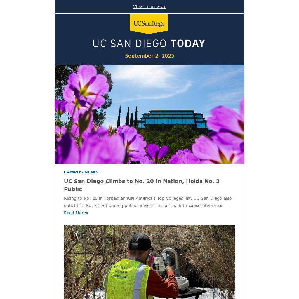 Rising to No. 20 in Forbes' annual America's Top Colleges list, UC San Diego also upheld its No. 3 spot among public universities for the fifth consecutive year. Read More»