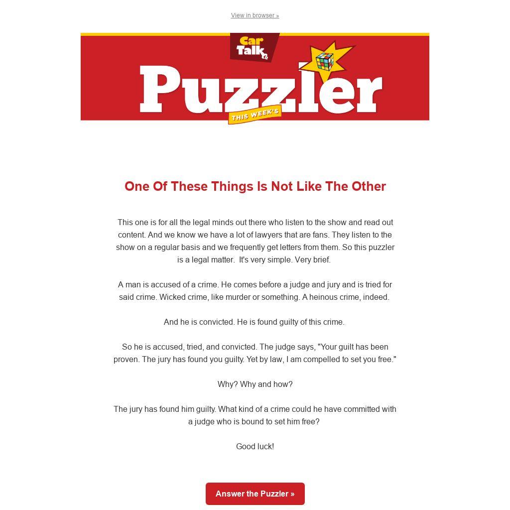 This one is for all the legal minds out there who listen to the show and read out content. And we know we have a lot of lawyers that are fans. They listen to the show on a regular basis and we frequently get letters from them. So this puzzler is a legal matter. It's very simple. Very brief.