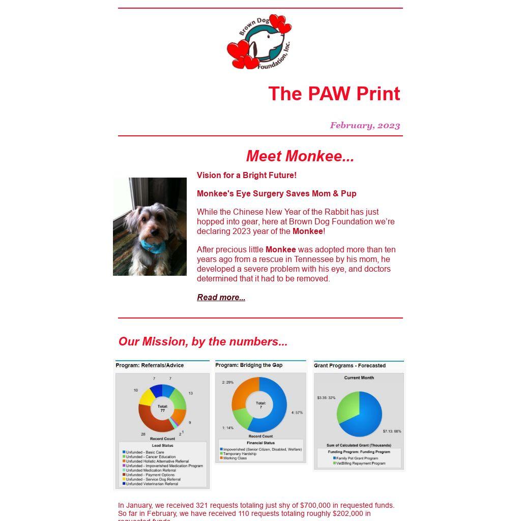 That’s where our Monthly Fetch program steps in. Commit to a donation each month ($5.00 to $5,000 – every dollar helps) to Brown Dog Foundation through Monthly Fetch,and know that you will be helping save the life of a beloved dog whose life depends on an often simple treatment that an owner cannot afford at the moment it's needed.