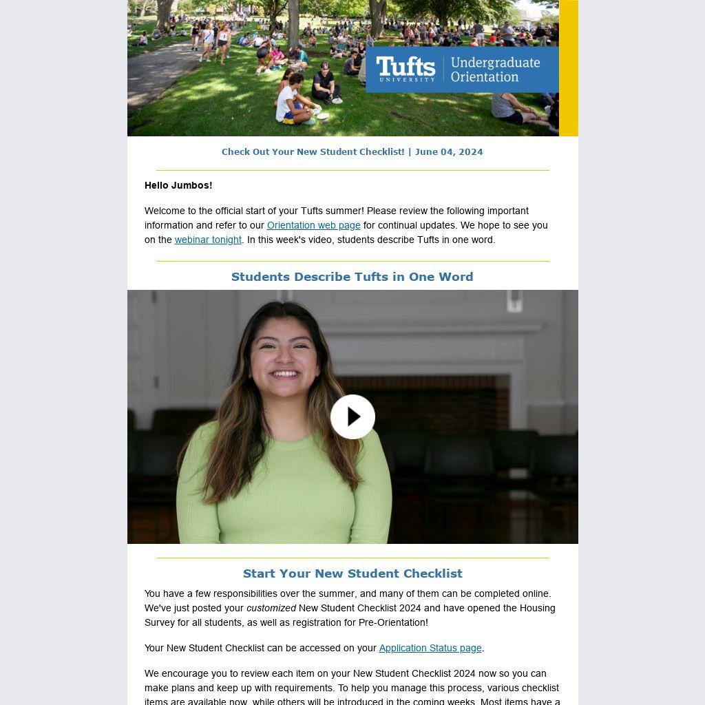 Welcome to the official start of your Tufts summer! Please review the following important information and refer to our Orientation web page for continual updates. We hope to see you on the webinar tonight. In this week's video, students describe Tufts in one word.