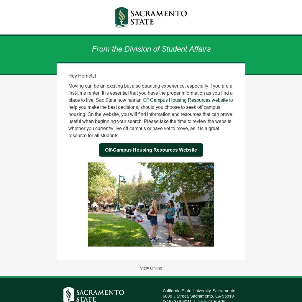 Moving can be an exciting but also daunting experience, especially if you are a first-time renter. It is essential that you have the proper information as you find a place to live. Sac State now has an Off-Campus Housing Resources website to help you make the best decisions, should you choose to seek off-campus housing. On the website, you will find information and resources that can prove useful when beginning your search. Please take the time to review the website whether you currently live off-campus or have yet to move, as it is a great resource for all students.