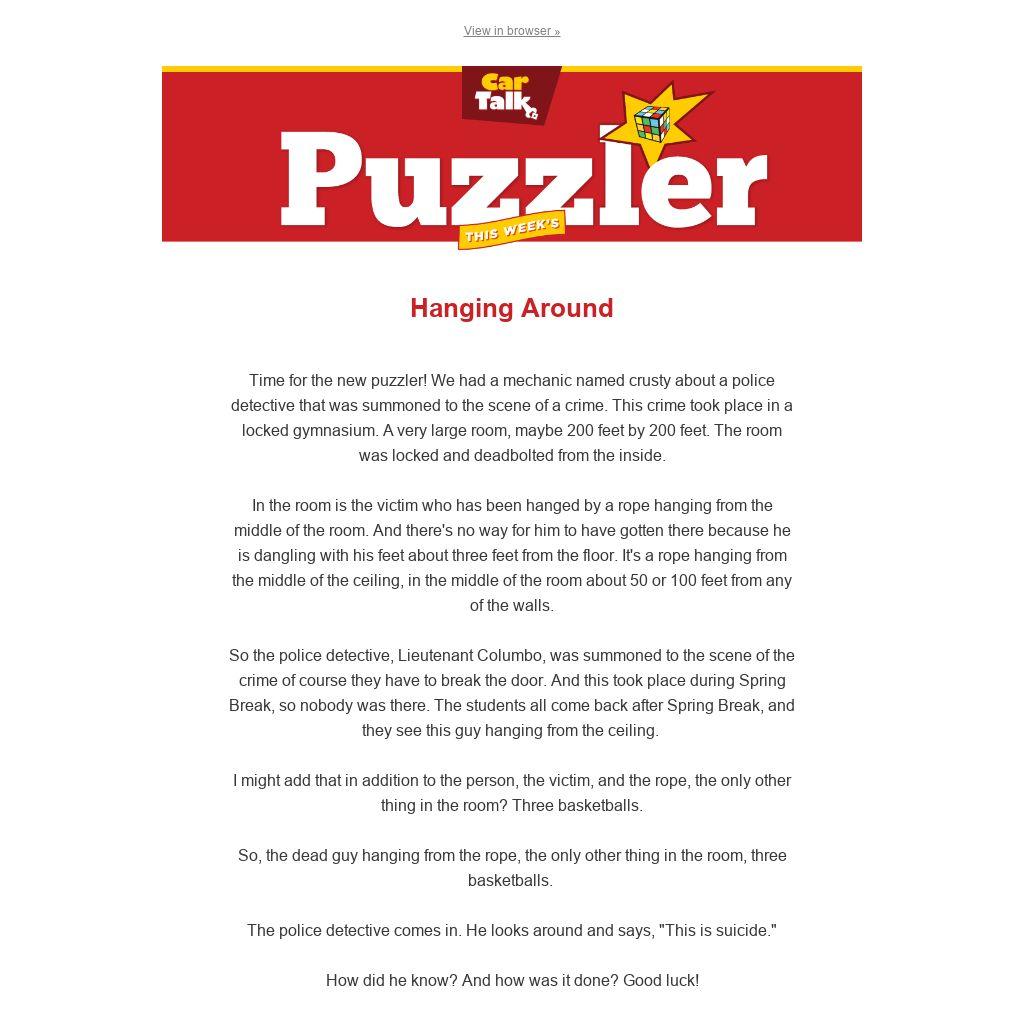 Time for the new puzzler! We had a mechanic named crusty about a police detective that was summoned to the scene of a crime. This crime took place in a locked gymnasium. A very large room, maybe 200 feet by 200 feet. The room was locked and deadbolted from the inside.