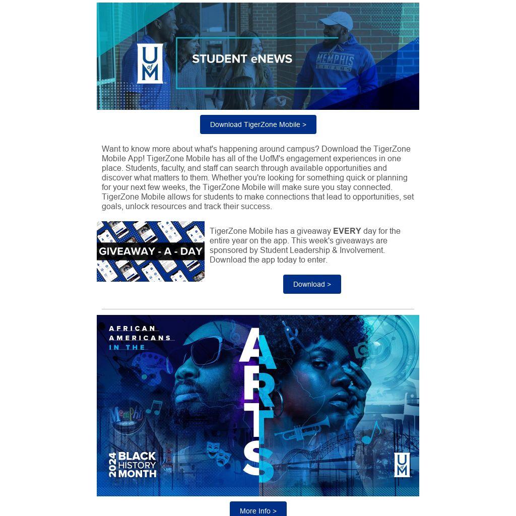 Want to know more about what's happening around campus? Download the TigerZone Mobile App! TigerZone Mobile has all of the UofM's engagement experiences in one place. Students, faculty, and staff can search through available opportunities and discover what matters to them. Whether you're looking for something quick or planning for your next few weeks, the TigerZone Mobile will make sure you stay connected. TigerZone Mobile allows for students to make connections that lead to opportunities, set goals, unlock resources and track their success.