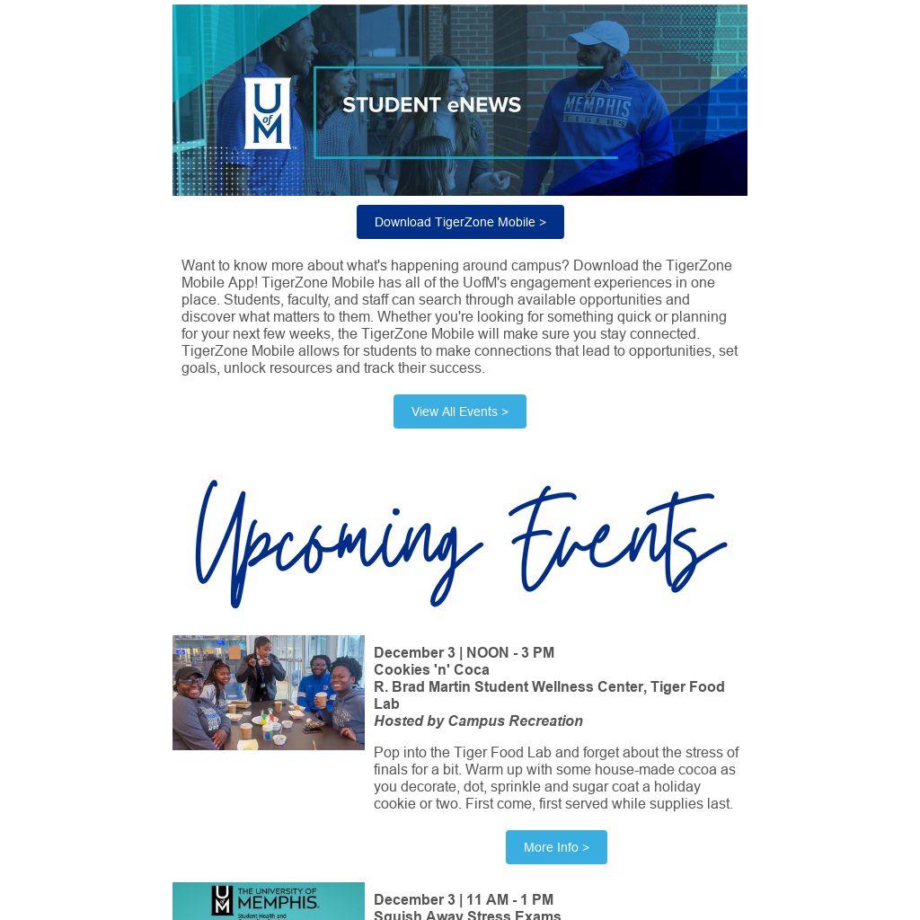 Remember to check in with your families or those who support you during this busy time of the semester. Let them know how you're doing and ways you need their support! Talk about your plans for the upcoming Thanksgiving holiday and semester break. - Do you need a little extra support for your upcoming finals? Finals Care Packages are on sale NOW, and can be purchased by your family to show you support during this stressful time! - Are you graduating in December 2024? Graduation Yard Signs are on sale now. These are a great way for you or your family to show support for this special time of your collegiate career!Contact us at parents@memphis.edu or (901) 678-2115.