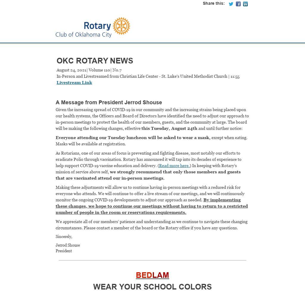 We appreciate all of our members’ patience and understanding as we continue to navigate these changing circumstances. Please contact a member of the board or the Rotary office if you have any questions.