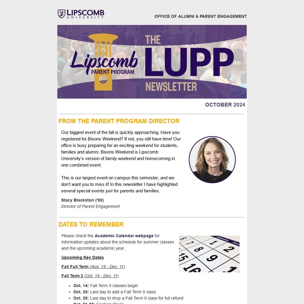 Our biggest event of the fall is quickly approaching. Have you registered for Bisons Weekend? If not, you still have time! Our office is busy preparing for an exciting weekend for students, families and alumni. Bisons Weekend is Lipscomb University’s version of family weekend and homecoming in one combined event.