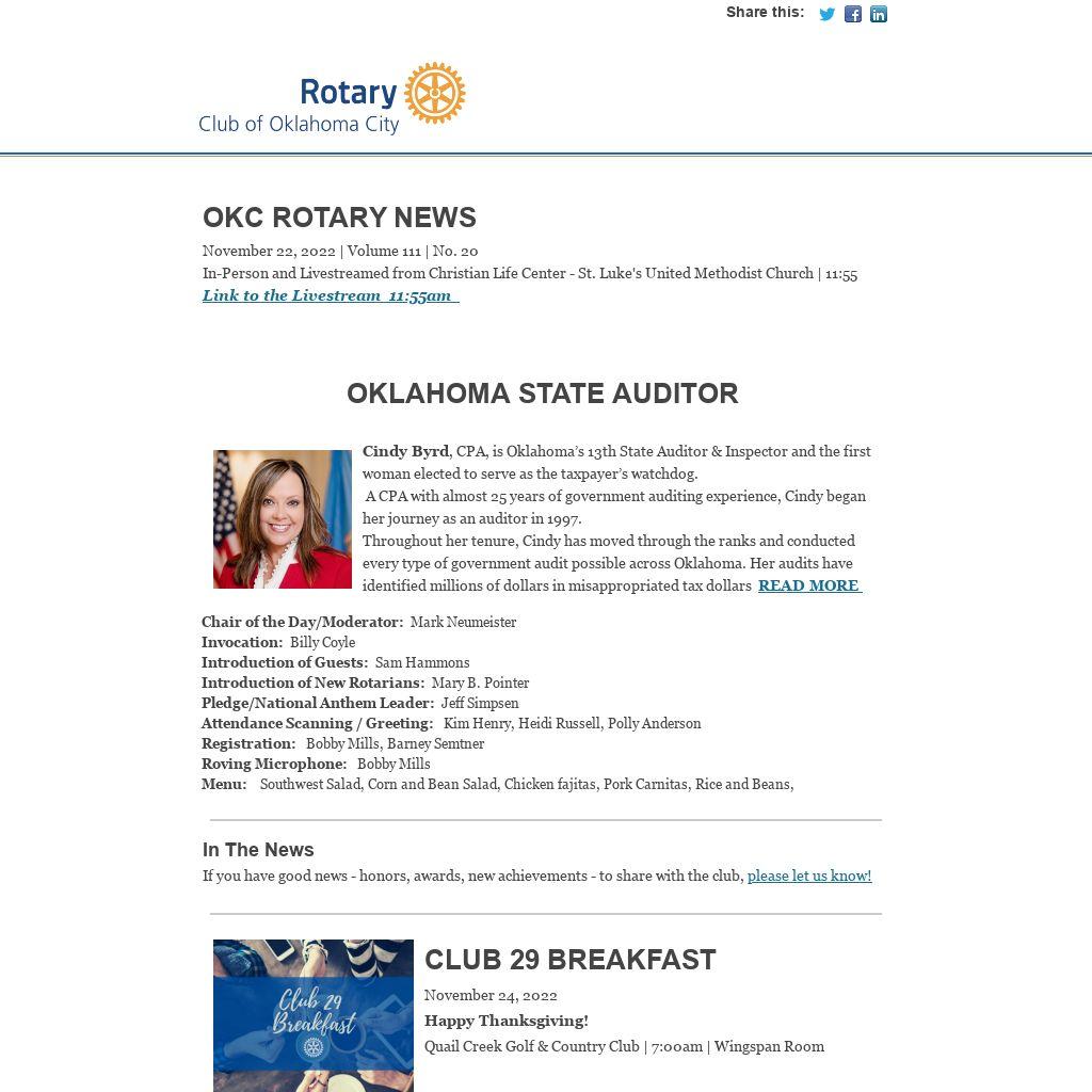 OKC Rotary NewsNovember 22, 2022 | Volume 111 | No. 20 In-Person and Livestreamed from Christian Life Center - St. Luke's United Methodist Church | 11:55