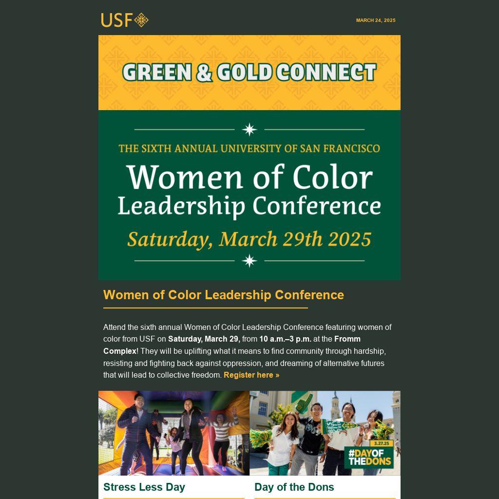 Attend the sixth annual Women of Color Leadership Conference featuring women of color from USF on Saturday, March 29, from 10 a.m.–3 p.m. at the Fromm Complex! They will be uplifting what it means to find community through hardship, resisting and fighting back against oppression, and dreaming of alternative futures that will lead to collective freedom. Register here »