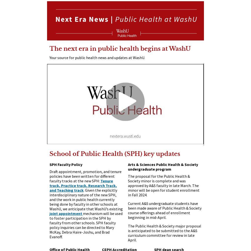 The Dean Recruitment and Nominations Committee is actively engaging with top public health leaders who are considering the inaugural dean position. Several of the nominees are seriously exploring the opportunities WashU has to offer, and the committee feels confident in its ability to present recommendations to the provost in the spring.