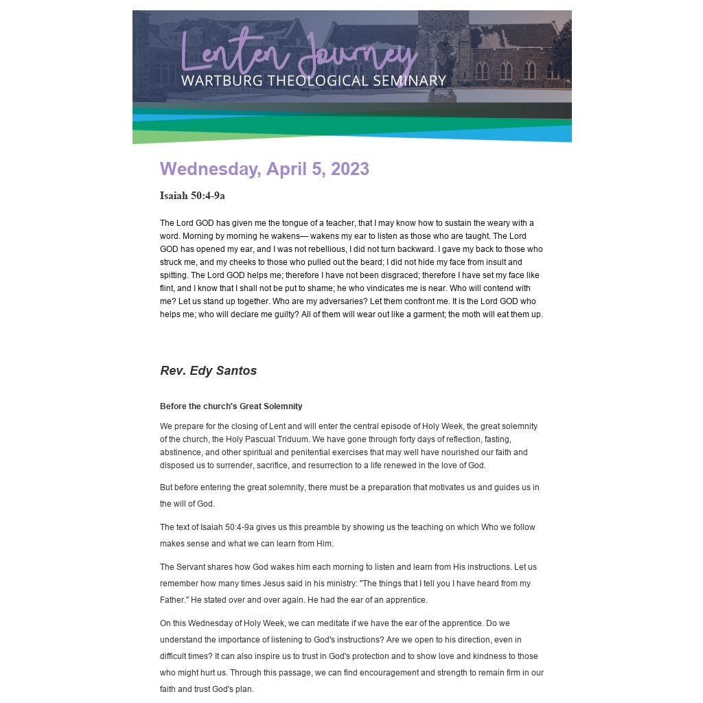 On this Wednesday of Holy Week, we can meditate if we have the ear of the apprentice. Do we understand the importance of listening to God's instructions? Are we open to his direction, even in difficult times? It can also inspire us to trust in God's protection and to show love and kindness to those who might hurt us. Through this passage, we can find encouragement and strength to remain firm in our faith and trust God's plan.