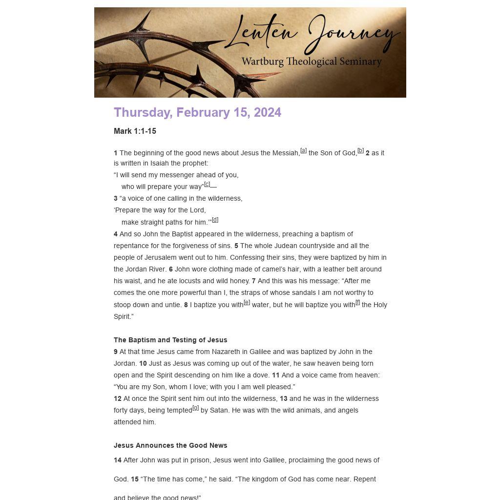 Mark introduces John the Baptist, a voice crying out in the wilderness, preparing the way for the Messiah. John's message is one of repentance and the forgiveness of sins. Lent invites us to heed this call, to examine our hearts, and to turn away from our sins.