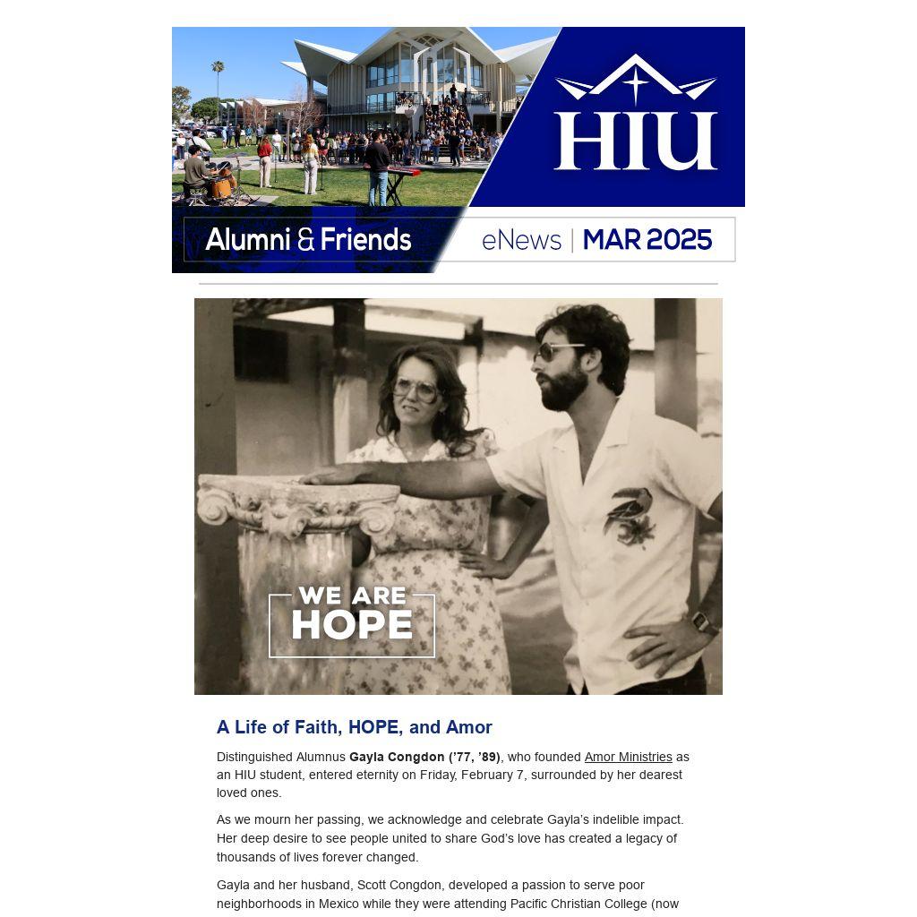 Distinguished Alumnus Gayla Congdon (’77, ’89), who founded Amor Ministries as an HIU student, entered eternity on Friday, February 7, surrounded by her dearest loved ones.