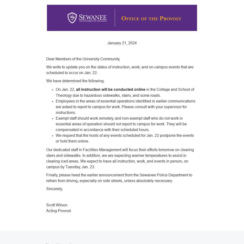 - On Jan. 22, all instruction will be conducted online in the College and School of Theology due to hazardous sidewalks, stairs, and some roads.