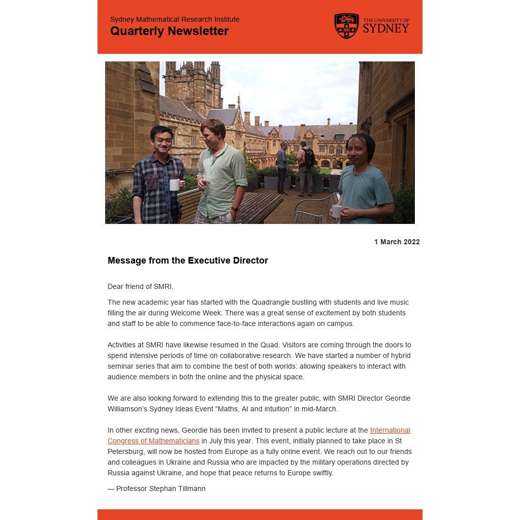 Activities at SMRI have likewise resumed in the Quad. Visitors are coming through the doors to spend intensive periods of time on collaborative research. We have started a number of hybrid seminar series that aim to combine the best of both worlds: allowing speakers to interact with audience members in both the online and the physical space.