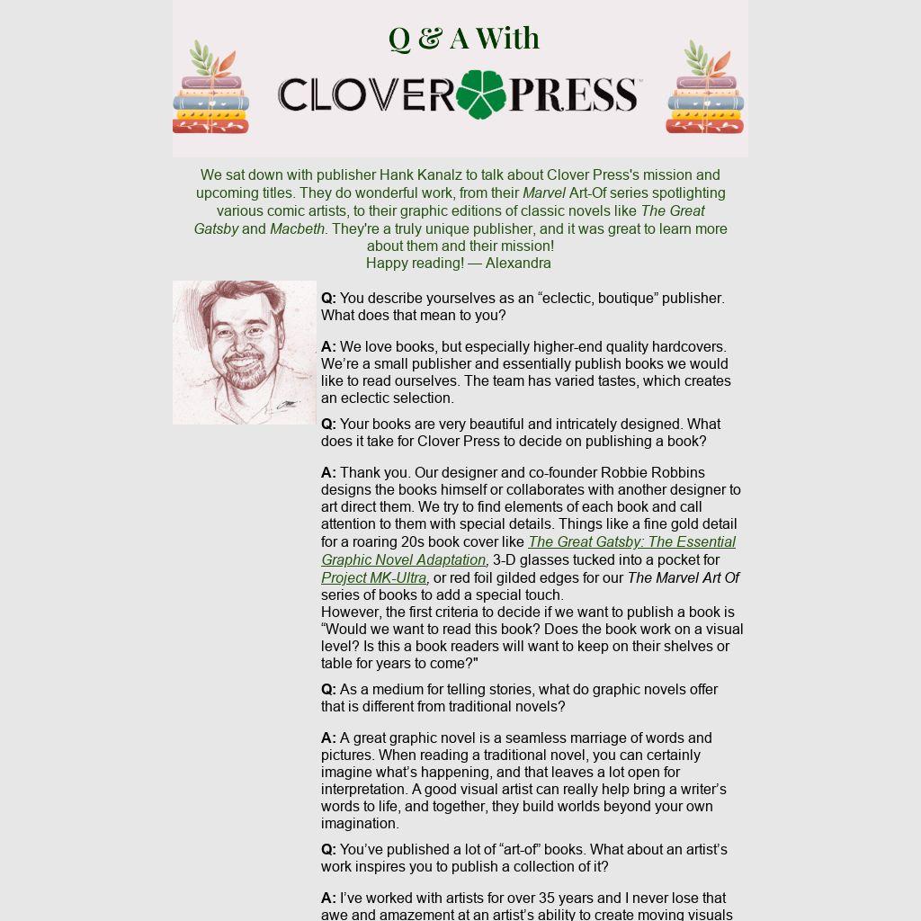 We sat down with publisher Hank Kanalz to talk about Clover Press's mission and upcoming titles. They do wonderful work, from their Marvel Art-Of series spotlighting various comic artists, to their graphic editions of classic novels like The Great Gatsby and Macbeth. They're a truly unique publisher, and it was great to learn more about them and their mission!