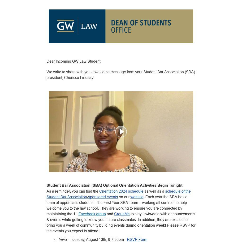 We write to share with you a welcome message from your Student Bar Association (SBA) president, Cherissa Lindsay!