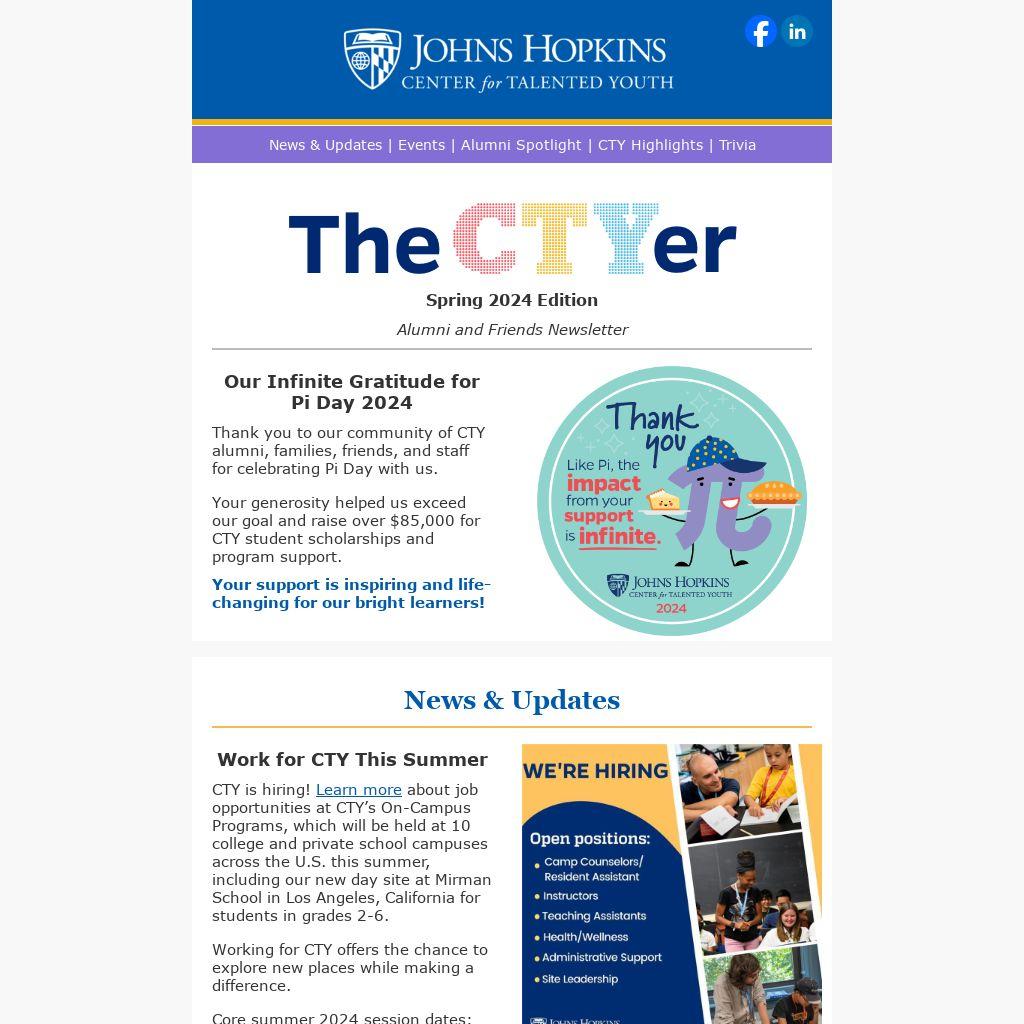 During Black History Month, CTY staff members shared their stories and reflections on the significance of the month. Similarly, during Women's History Month, we put a spotlight on the accomplishments and impact of our alumnae. These features exemplify our commitment to honoring and amplifying voices from diverse backgrounds. Your advocacy and contributions are deeply valued at CTY and benefit our whole community.