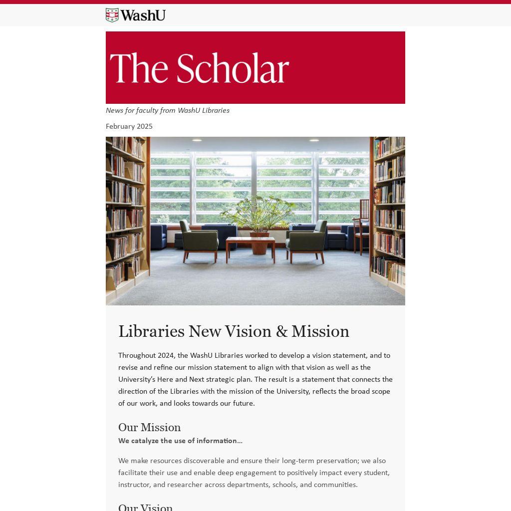 Throughout 2024, the WashU Libraries worked to develop a vision statement, and to revise and refine our mission statement to align with that vision as well as the University’s Here and Next strategic plan. The result is a statement that connects the direction of the Libraries with the mission of the University, reflects the broad scope of our work, and looks towards our future.