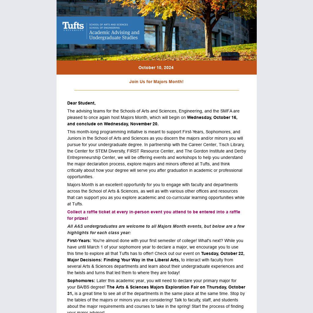 First-Years: You're almost done with your first semester of college! What's next? While you have until March 1 of your sophomore year to declare a major, we encourage you to use this time to explore all that Tufts has to offer! Check out our event on Tuesday, October 22, Major Decisions: Finding Your Way in the Liberal Arts, to interact with faculty from several Arts & Sciences departments and learn about their undergraduate experiences and the twists and turns that led them to where they are today!