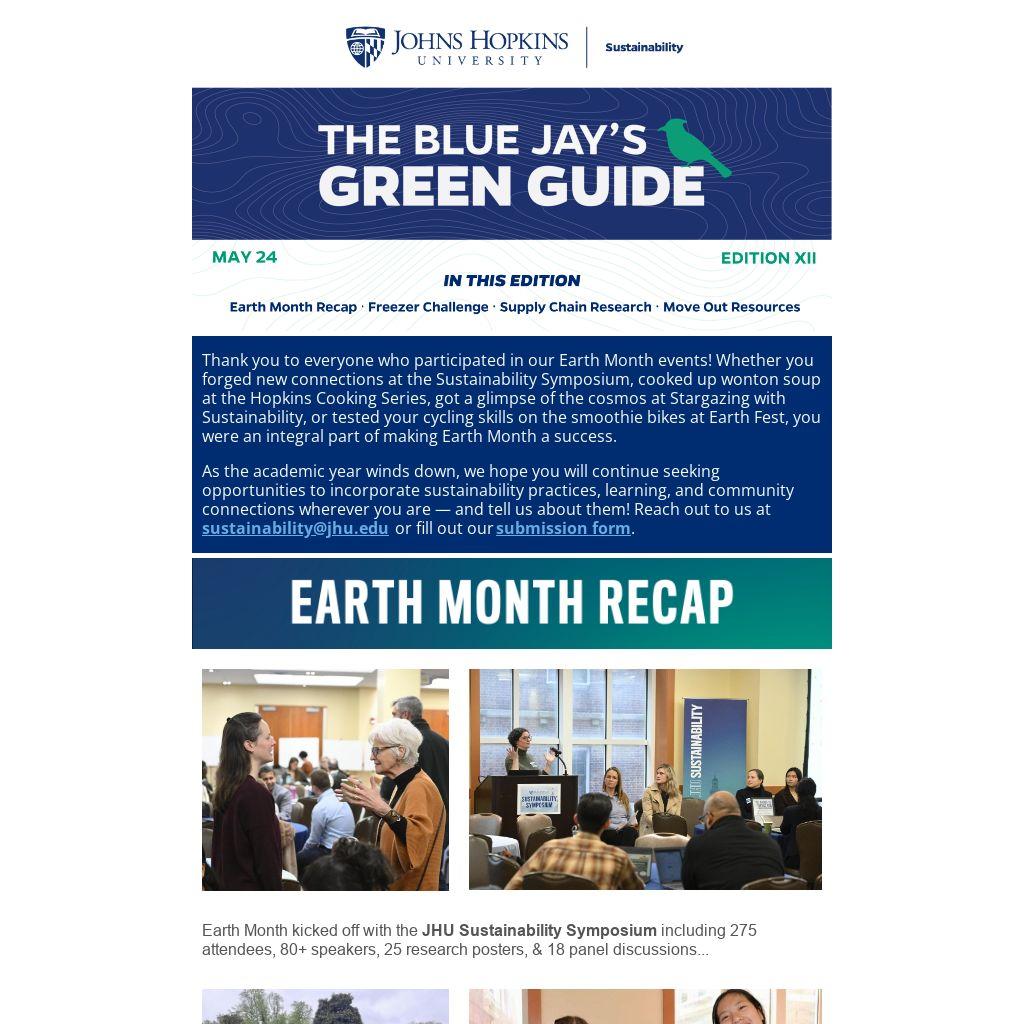 As the academic year winds down, we hope you will continue seeking opportunities to incorporate sustainability practices, learning, and community connections wherever you are — and tell us about them! Reach out to us at sustainability@jhu.edu or fill out our submission form.