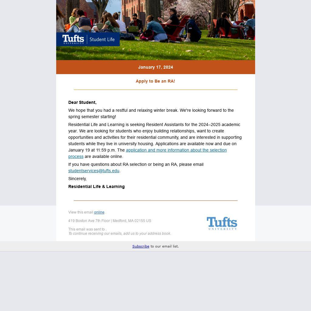 If you have questions about RA selection or being an RA, please email studentservices@tufts.edu.