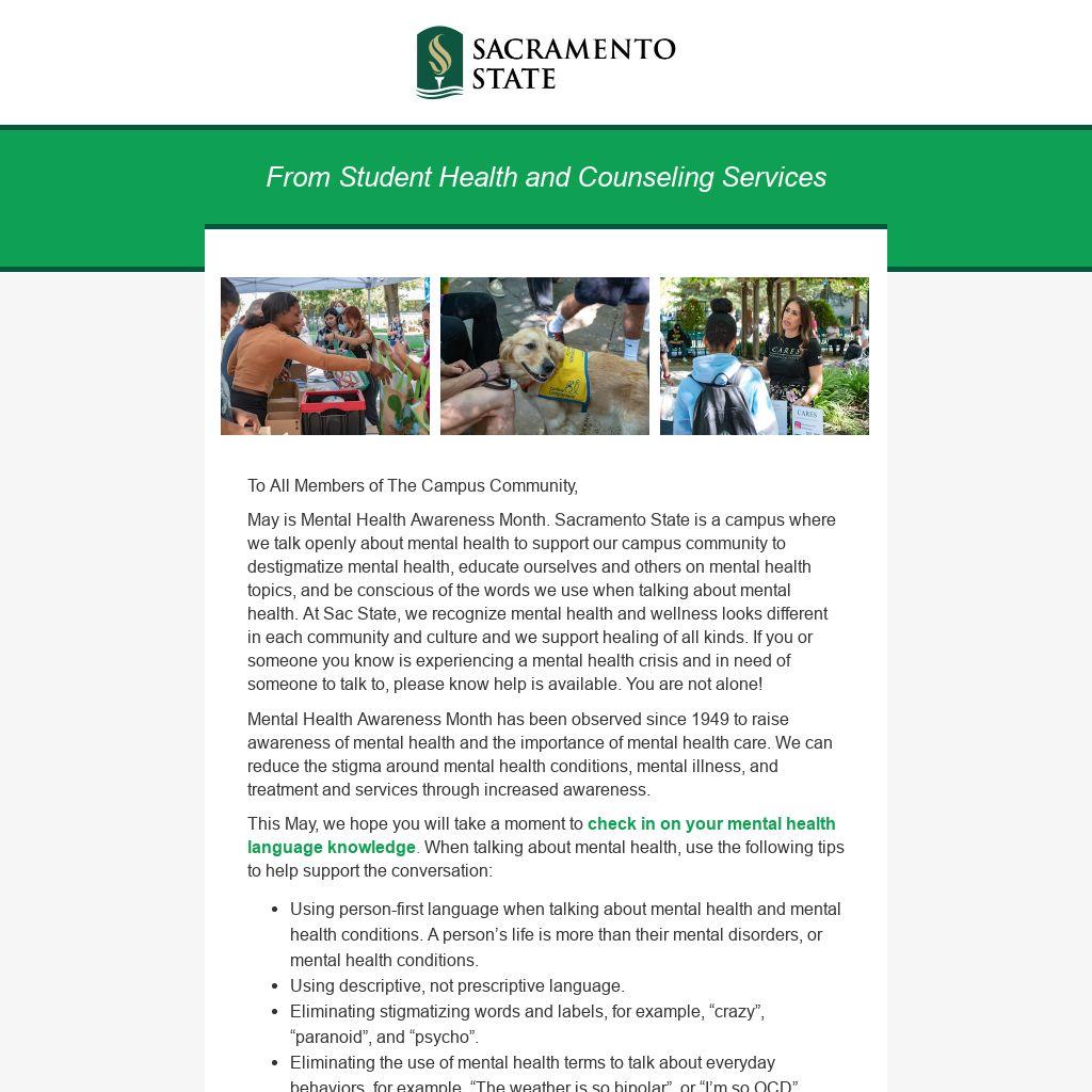 May is Mental Health Awareness Month. Sacramento State is a campus where we talk openly about mental health to support our campus community to destigmatize mental health, educate ourselves and others on mental health topics, and be conscious of the words we use when talking about mental health. At Sac State, we recognize mental health and wellness looks different in each community and culture and we support healing of all kinds. If you or someone you know is experiencing a mental health crisis and in need of someone to talk to, please know help is available. You are not alone!