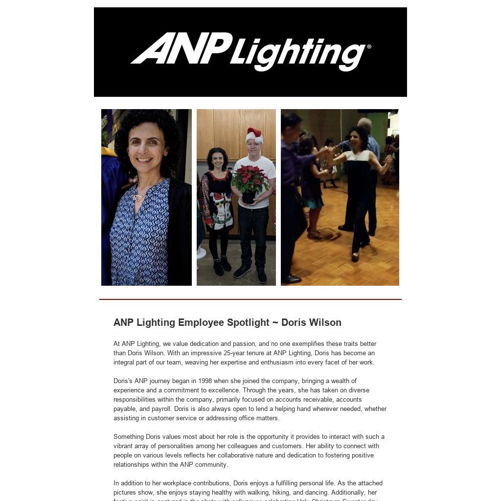 Doris Wilson shares the values of dedication, adaptability, and genuine connection that define ANP Lighting. Her unwavering commitment to her work and vibrant team presence make her a cherished family member. As we celebrate her milestone of 25 years with ANP, we thank Doris for her invaluable contributions and we look forward to sharing many more years of success and camaraderie.