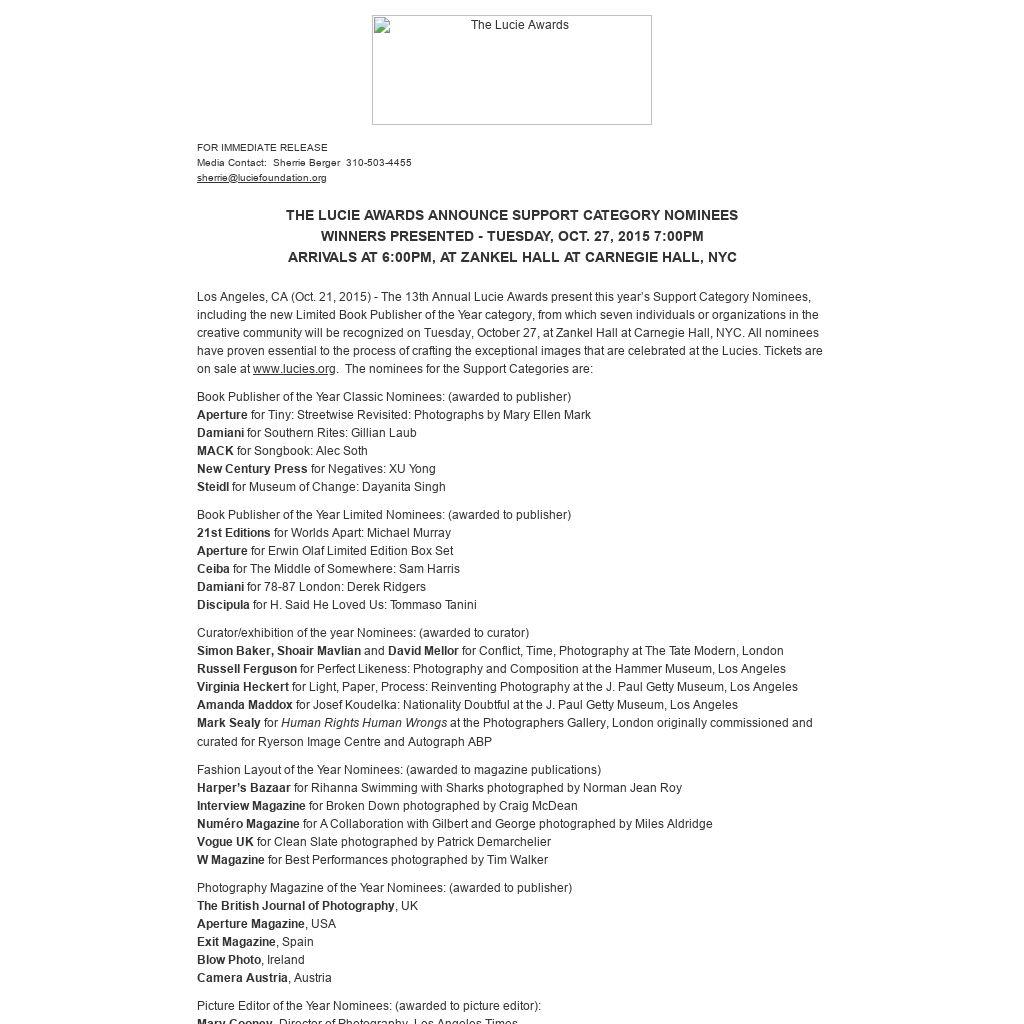 Los Angeles, CA (Oct. 21, 2015) - The 13th Annual Lucie Awards present this year’s Support Category Nominees, including the new Limited Book Publisher of the Year category, from which seven individuals or organizations in the creative community will be recognized on Tuesday, October 27, at Zankel Hall at Carnegie Hall, NYC. All nominees have proven essential to the process of crafting the exceptional images that are celebrated at the Lucies. Tickets are on sale at www.lucies.org. The nominees for the Support Categories are: Book Publisher of the Year Classic Nominees: (awarded to publisher)