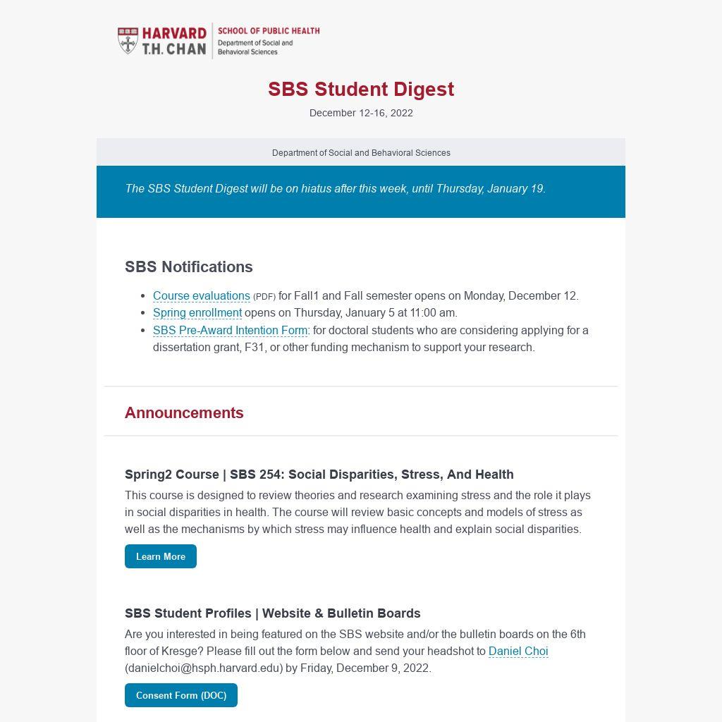 Are you interested in being featured on the SBS website and/or the bulletin boards on the 6th floor of Kresge? Please fill out the form below and send your headshot to Daniel Choi (danielchoi@hsph.harvard.edu) by Friday, December 9, 2022.