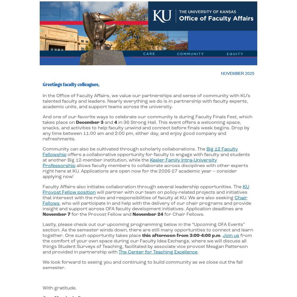 Faculty Affairs also initiates collaboration through several leadership opportunities. The KU Provost Fellow position will partner with our team on policy-related projects and initiatives that intersect with the roles and responsibilities of faculty at KU. We are also seeking Chair Fellows, who will participate in and help with the delivery of our chair programs and provide insight and support across OFA faculty development initiatives. Application deadlines are November 7 for the Provost Fellow and November 24 for Chair Fellows.