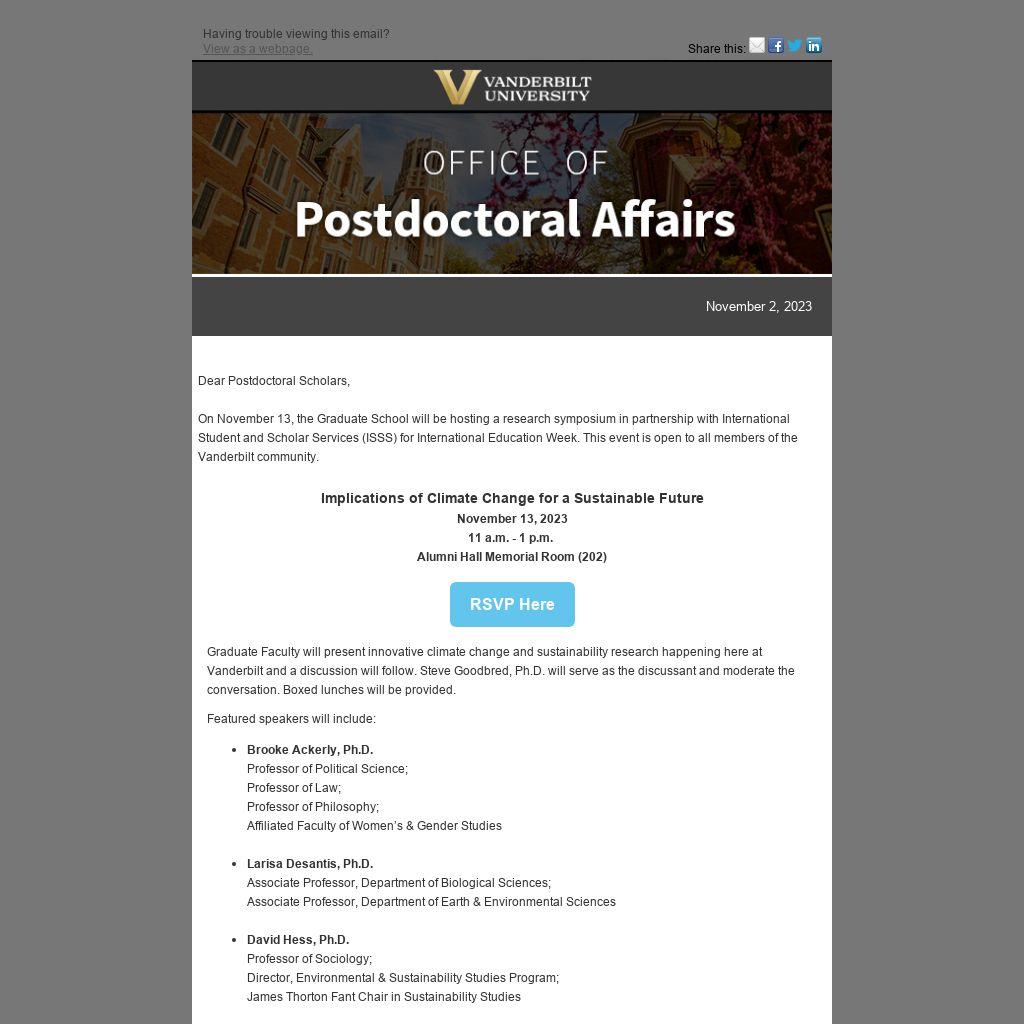 Graduate Faculty will present innovative climate change and sustainability research happening here at Vanderbilt and a discussion will follow. Steve Goodbred, Ph.D. will serve as the discussant and moderate the conversation. Boxed lunches will be provided.