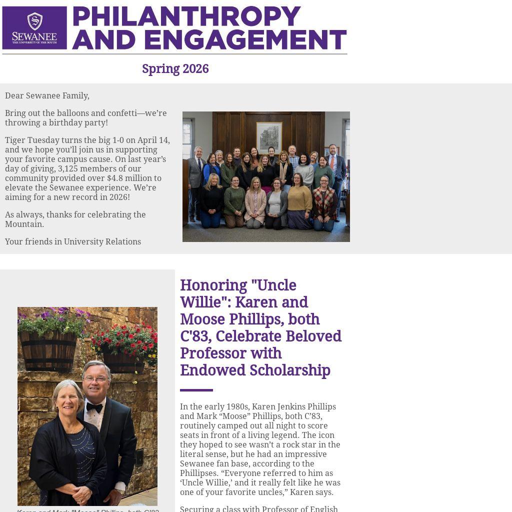 Tiger Tuesday turns the big 1-0 on April 14, and we hope you’ll join us in supporting your favorite campus cause. On last year’s day of giving, 3,125 members of our community provided over $4.8 million to elevate the Sewanee experience. We’re aiming for a new record in 2026!