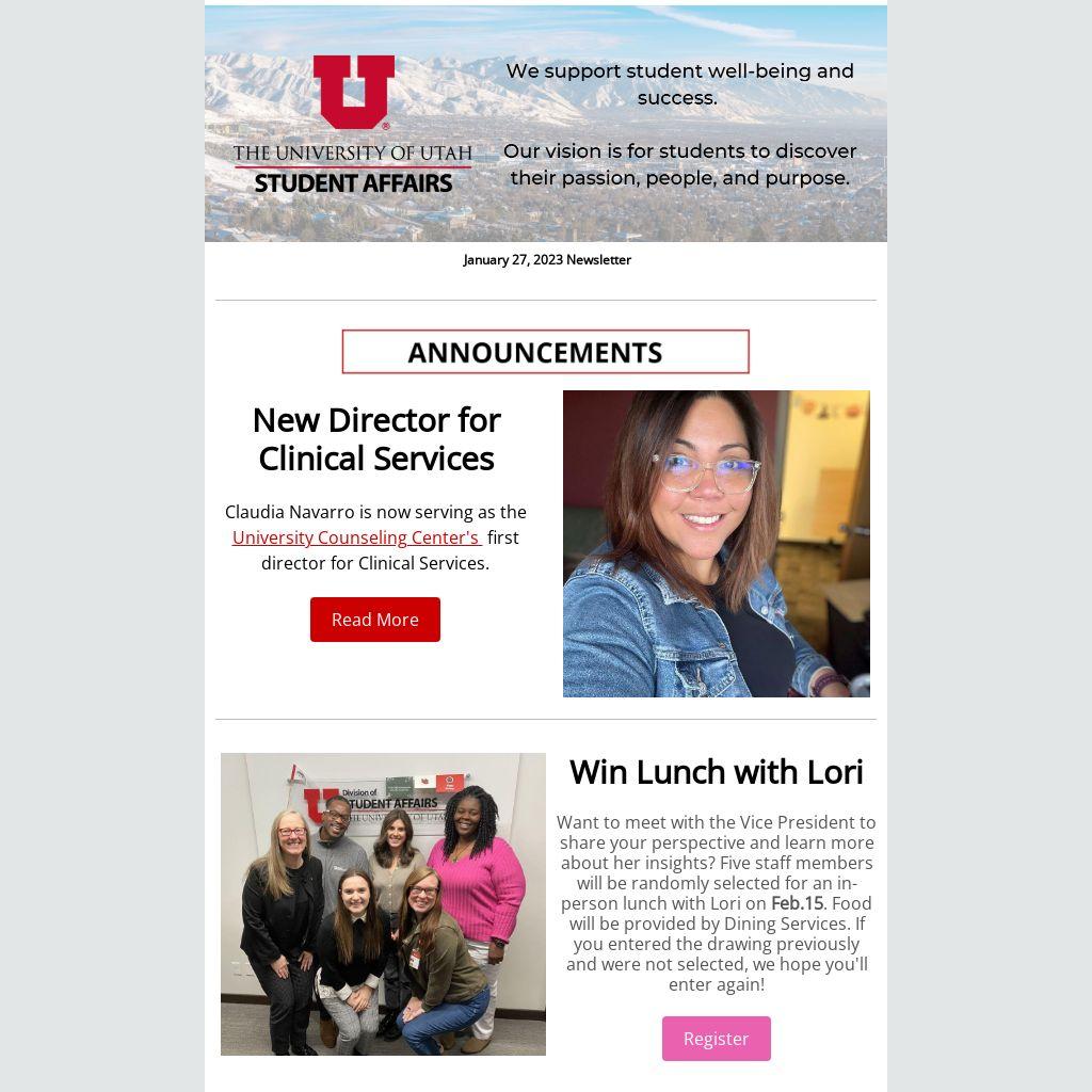 Want to meet with the Vice President to share your perspective and learn more about her insights? Five staff members will be randomly selected for an in-person lunch with Lori on Feb.15. Food will be provided by Dining Services. If you entered the drawing previously and were not selected, we hope you'll enter again!