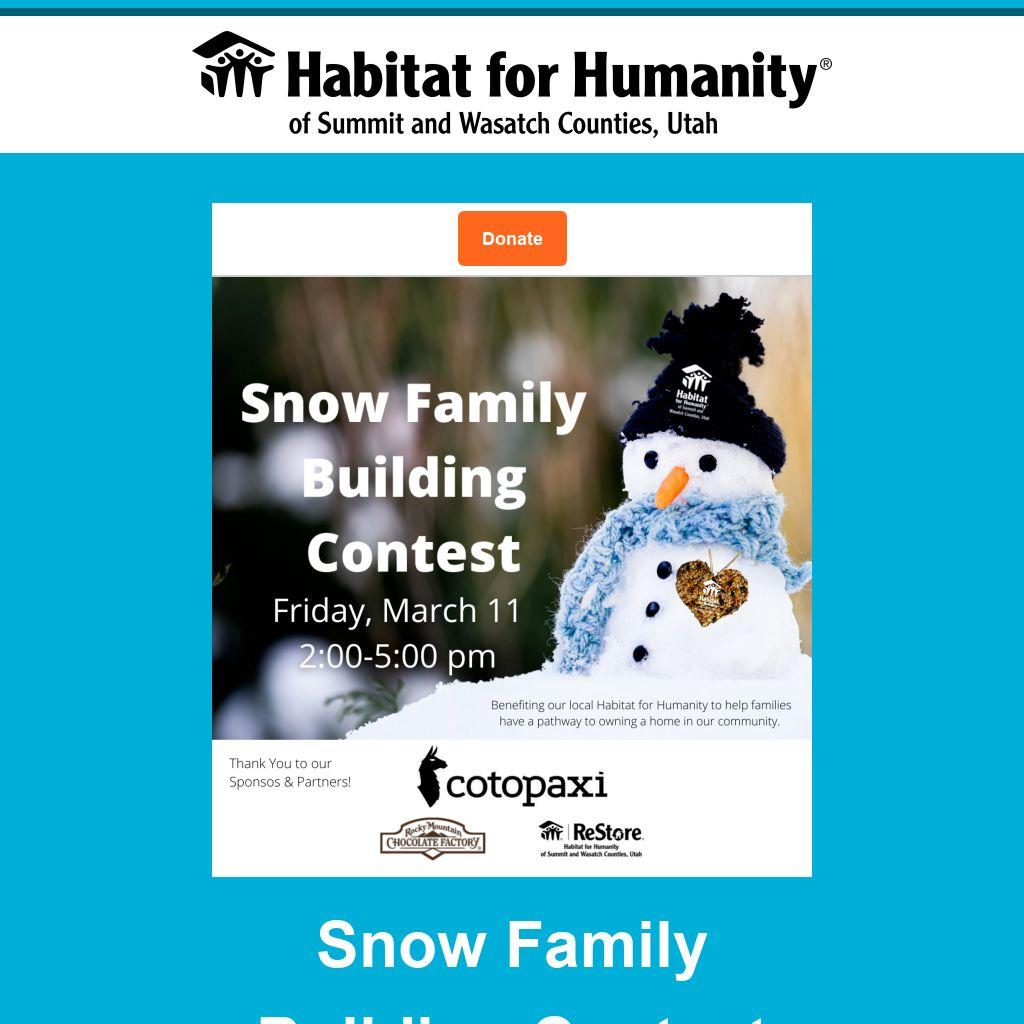 Our inaugural Snow Family Building Contest happens Friday, March 11 from 2:00 - 5:00 PM at Willow Creek Park. Grab your kids, grandkids, friends and make a team to build the best snow sculptures ever! Registration is open now, so sign up your team for a fun, friendly competition and family-oriented event!