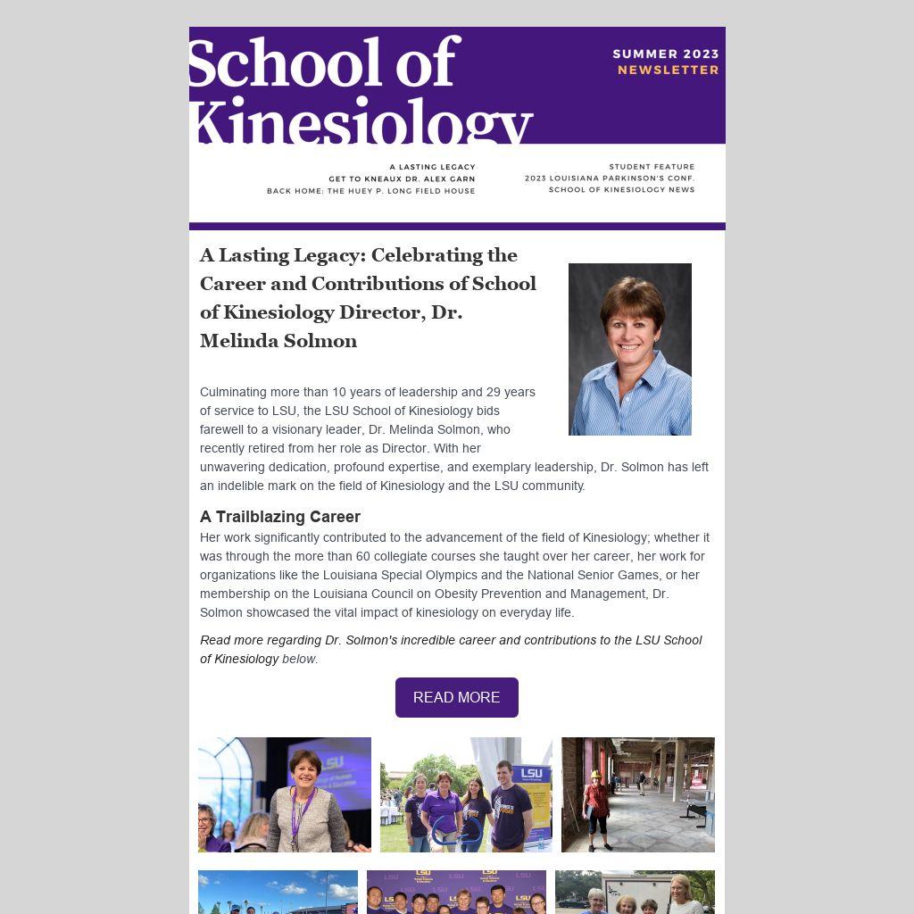Culminating more than 10 years of leadership and 29 years of service to LSU, the LSU School of Kinesiology bids farewell to a visionary leader, Dr. Melinda Solmon, who recently retired from her role as Director. With her unwavering dedication, profound expertise, and exemplary leadership, Dr. Solmon has left an indelible mark on the field of Kinesiology and the LSU community.