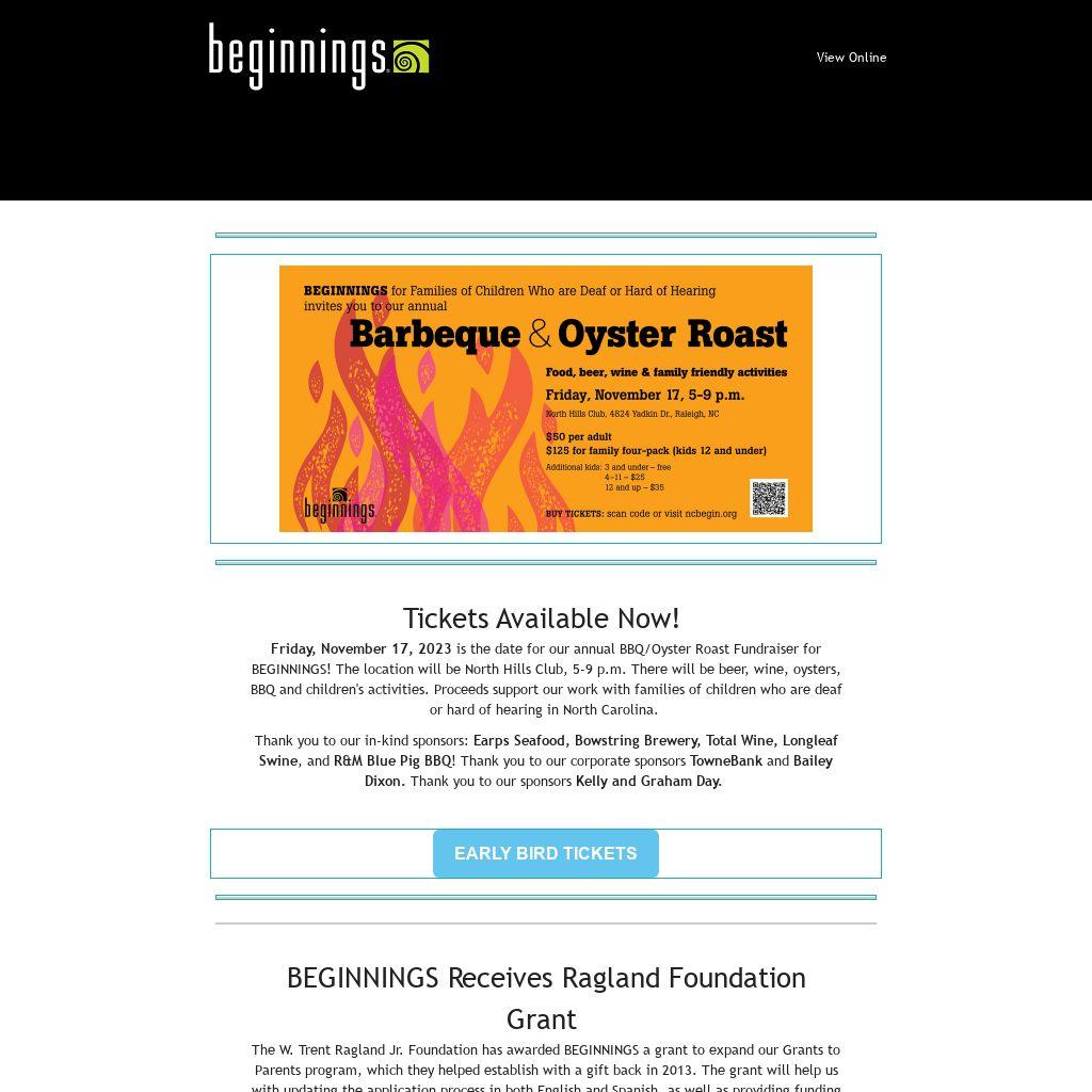 Friday, November 17, 2023 is the date for our annual BBQ/Oyster Roast Fundraiser for BEGINNINGS! The location will be North Hills Club, 5-9 p.m. There will be beer, wine, oysters, BBQ and children's activities. Proceeds support our work with families of children who are deaf or hard of hearing in North Carolina.
