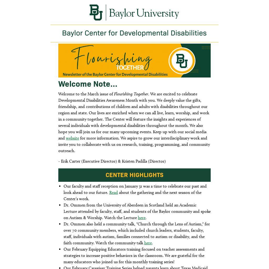 Welcome to the March issue of Flourishing Together. We are excited to celebrate Developmental Disabilities Awareness Month with you. We deeply value the gifts, friendship, and contributions of children and adults with disabilities throughout our region and state. Our lives are enriched when we can all live, learn, worship, and work in a community together. The Center will feature the insights and experiences of several individuals with developmental disabilities throughout the month. We also hope you will join us for our many upcoming events. Keep up with our social media and website for more information. We aspire to grow our interdisciplinary work and invite you to collaborate with us on research, training, programming, and community outreach.
