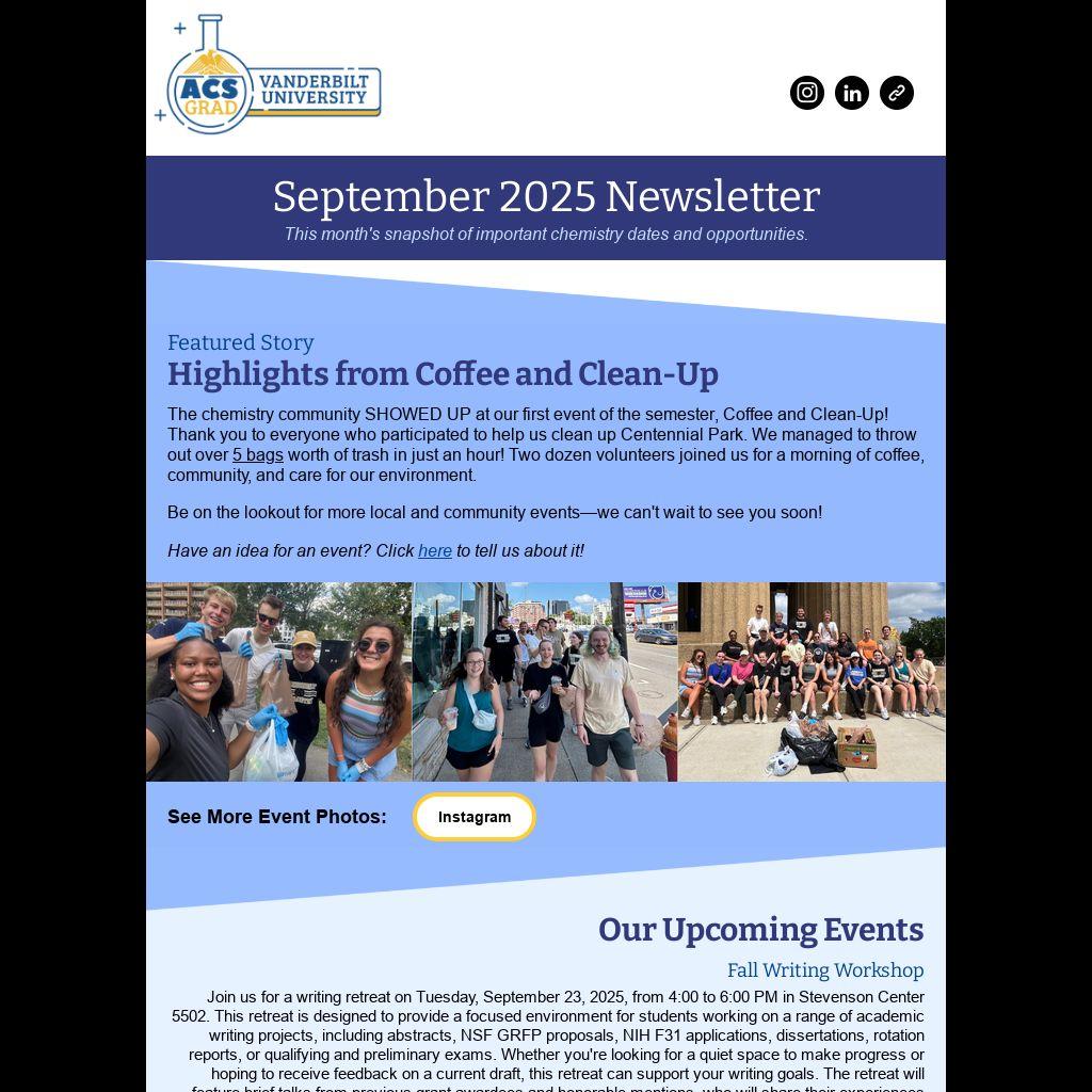 The chemistry community SHOWED UP at our first event of the semester, Coffee and Clean-Up! Thank you to everyone who participated to help us clean up Centennial Park. We managed to throw out over 5 bags worth of trash in just an hour! Two dozen volunteers joined us for a morning of coffee, community, and care for our environment.