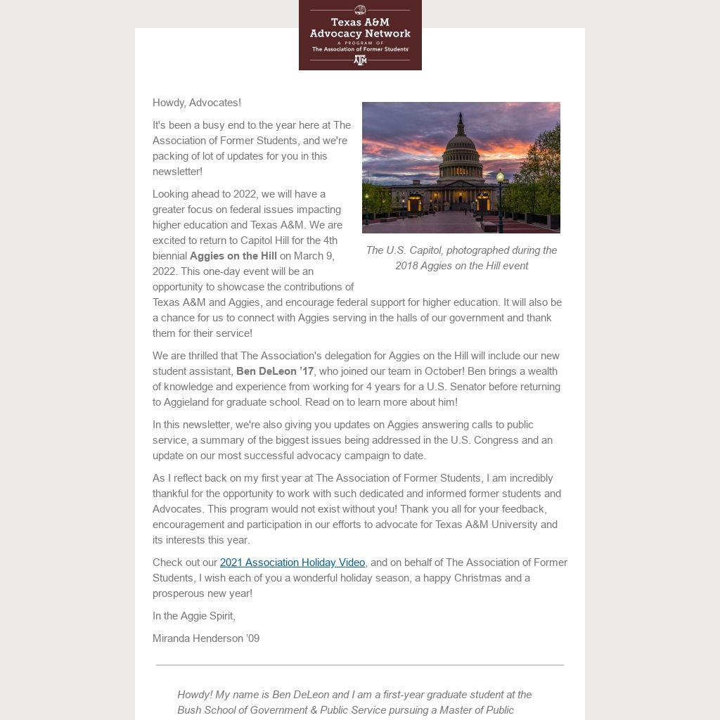 &M Advocacy Network sent a "Call to Action" to Advocates, requesting help with an issue of great impact to Texas A&M University and the Texas A&M University System. United Airlines had recently announced its plans to end all service to Easterwood Airport (CLL) in Bryan-College Station, effective Jan. 3, 2022. We requested Advocates like you use our advocacy platform to send an email to United Airlines requesting reconsideration of this decision.