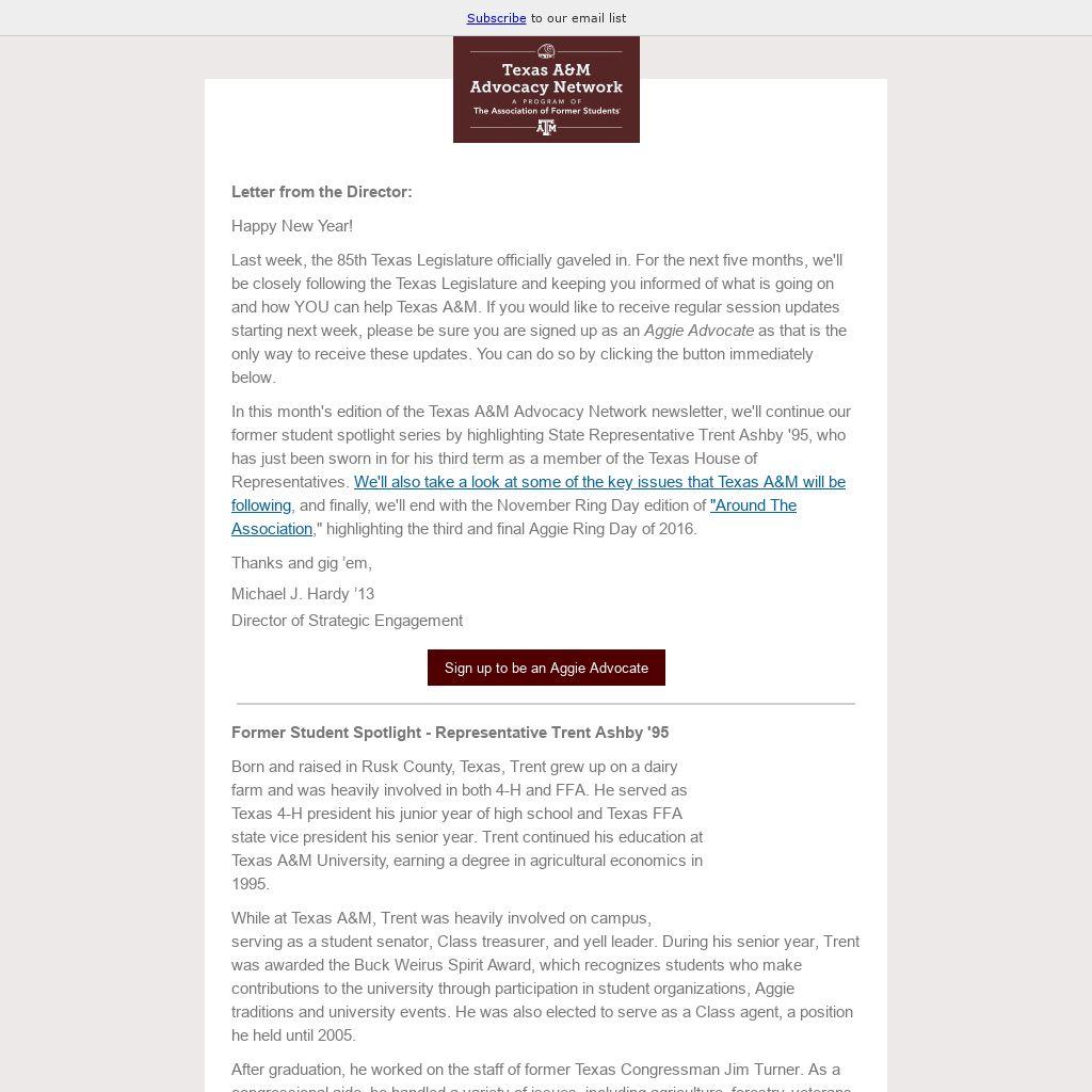 If you have any interest in receiving regular updates on issues of importance to Texas A&M, particularly during the legislative session, I encourage you to sign up to be an