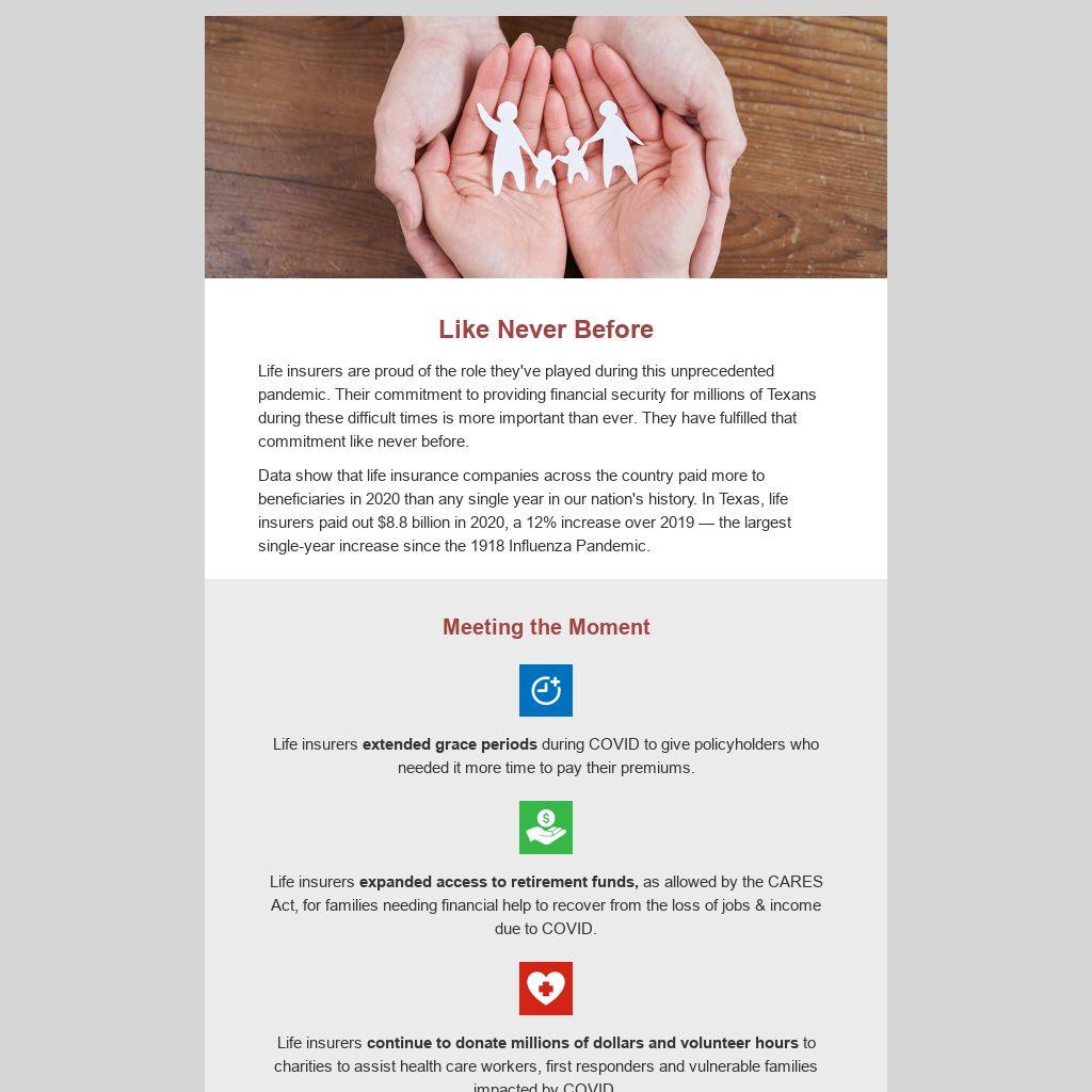 Life insurers are proud of the role they've played during this unprecedented pandemic. Their commitment to providing financial security for millions of Texans during these difficult times is more important than ever. They have fulfilled that commitment like never before.