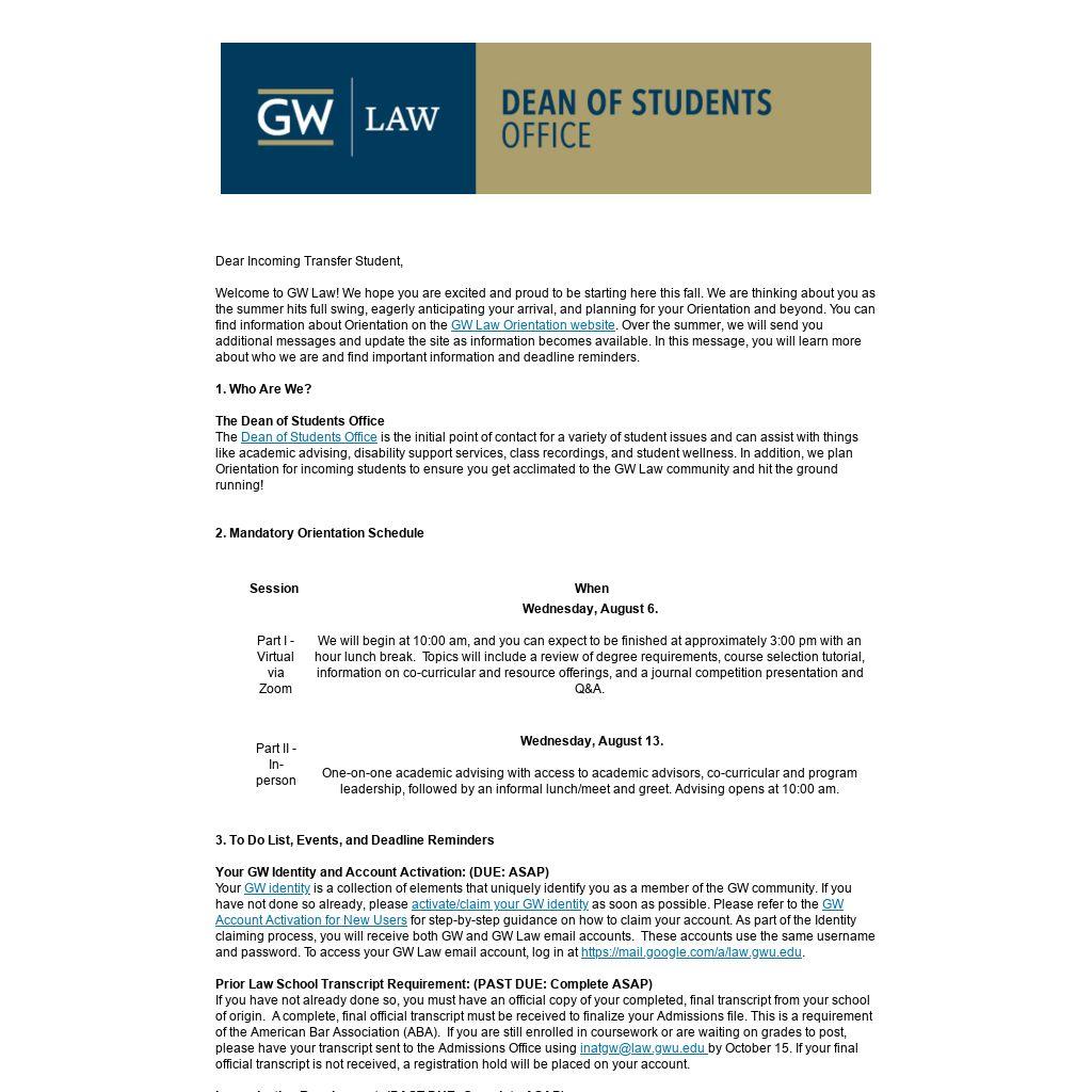 Welcome to GW Law! We hope you are excited and proud to be starting here this fall. We are thinking about you as the summer hits full swing, eagerly anticipating your arrival, and planning for your Orientation and beyond. You can find information about Orientation on the GW Law Orientation website. Over the summer, we will send you additional messages and update the site as information becomes available. In this message, you will learn more about who we are and find important information and deadline reminders.