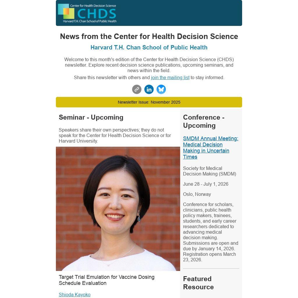 Welcome to this month's edition of the Center for Health Decision Science (CHDS) newsletter. Explore recent decision science publications, upcoming seminars, and news within the field.