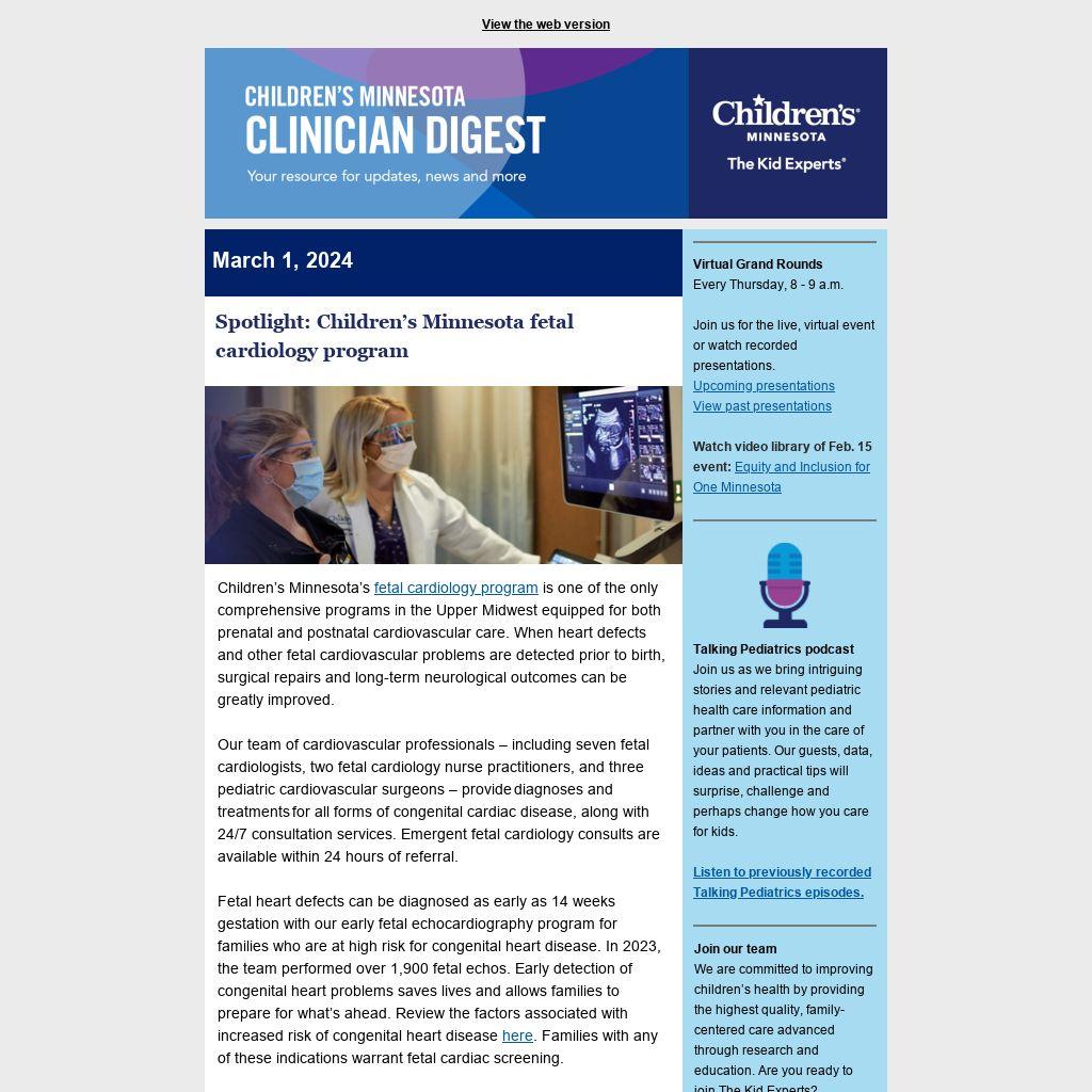 Share the knowledge If you find this newsletter valuable, we invite you to send this email to your colleagues so that they can learn about what's happening at Children's Minnesota. If this email was forwarded to you, we encourage you to sign up for the Children's Minnesota Clinician Digest.