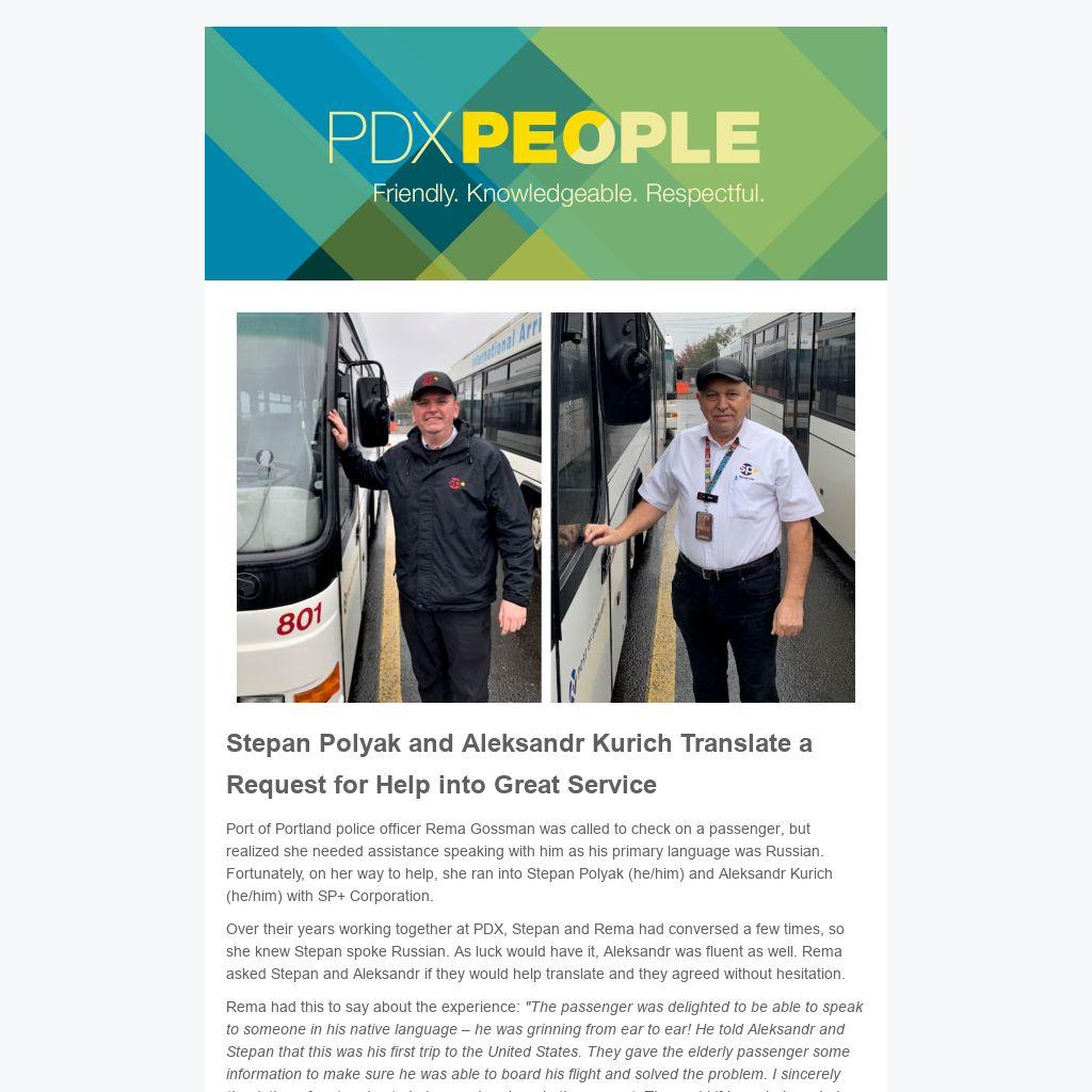 Stepan and Aleksandr were honored at the PDX People Customer Service Awards, where we recognize airport employees who truly stand out as extraordinary. Missed the virtual awards ceremony? View the event recording or read about past winners. You can also nominate an employee who embodies the PDX People values and serves as a shining example of great customer service for next quarter – submit a nomination now. Nominations for the April Customer Service Awards are due Thursday, March 31.