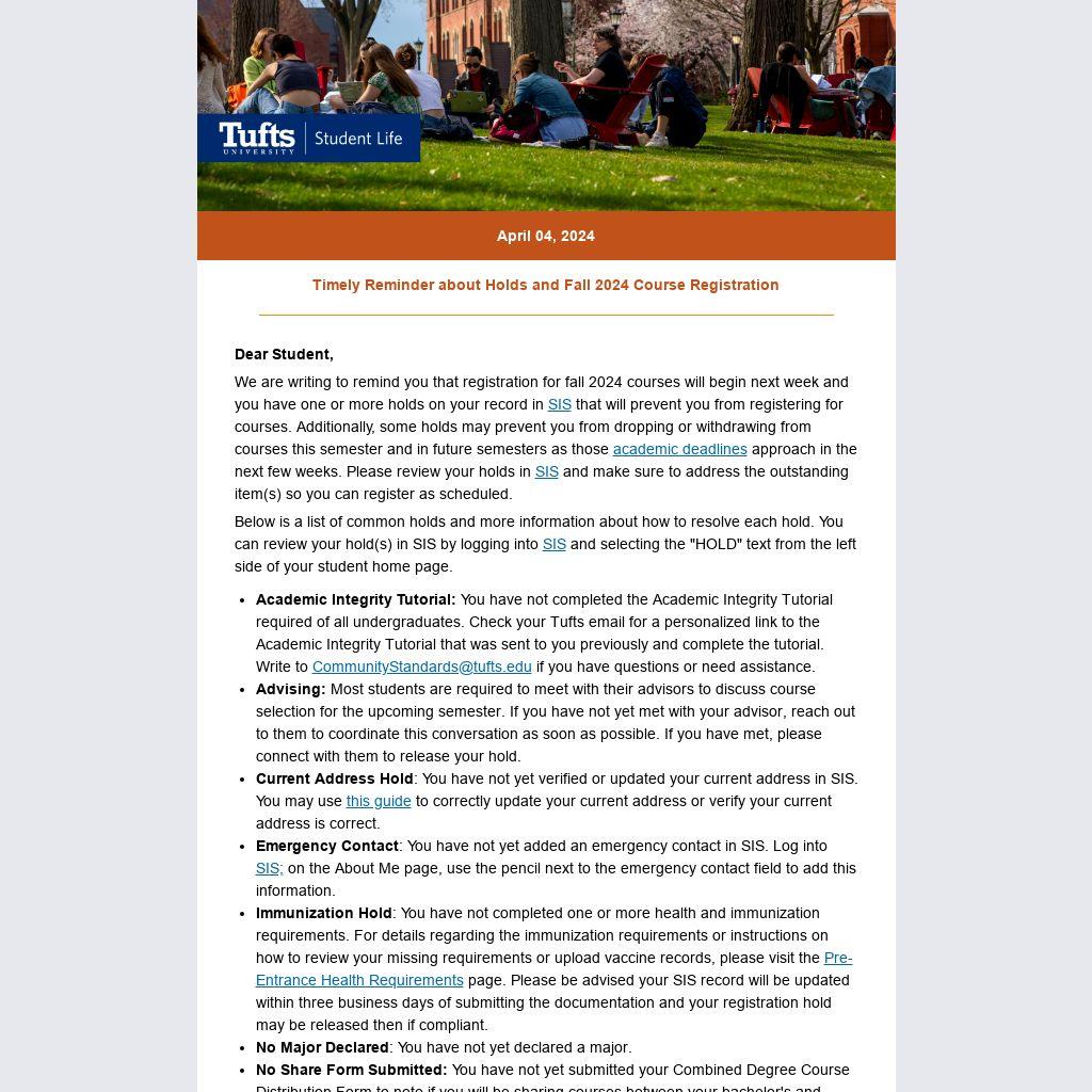 We are writing to remind you that registration for fall 2024 courses will begin next week and you have one or more holds on your record in SIS that will prevent you from registering for courses. Additionally, some holds may prevent you from dropping or withdrawing from courses this semester and in future semesters as those academic deadlines approach in the next few weeks. Please review your holds in SIS and make sure to address the outstanding item(s) so you can register as scheduled.